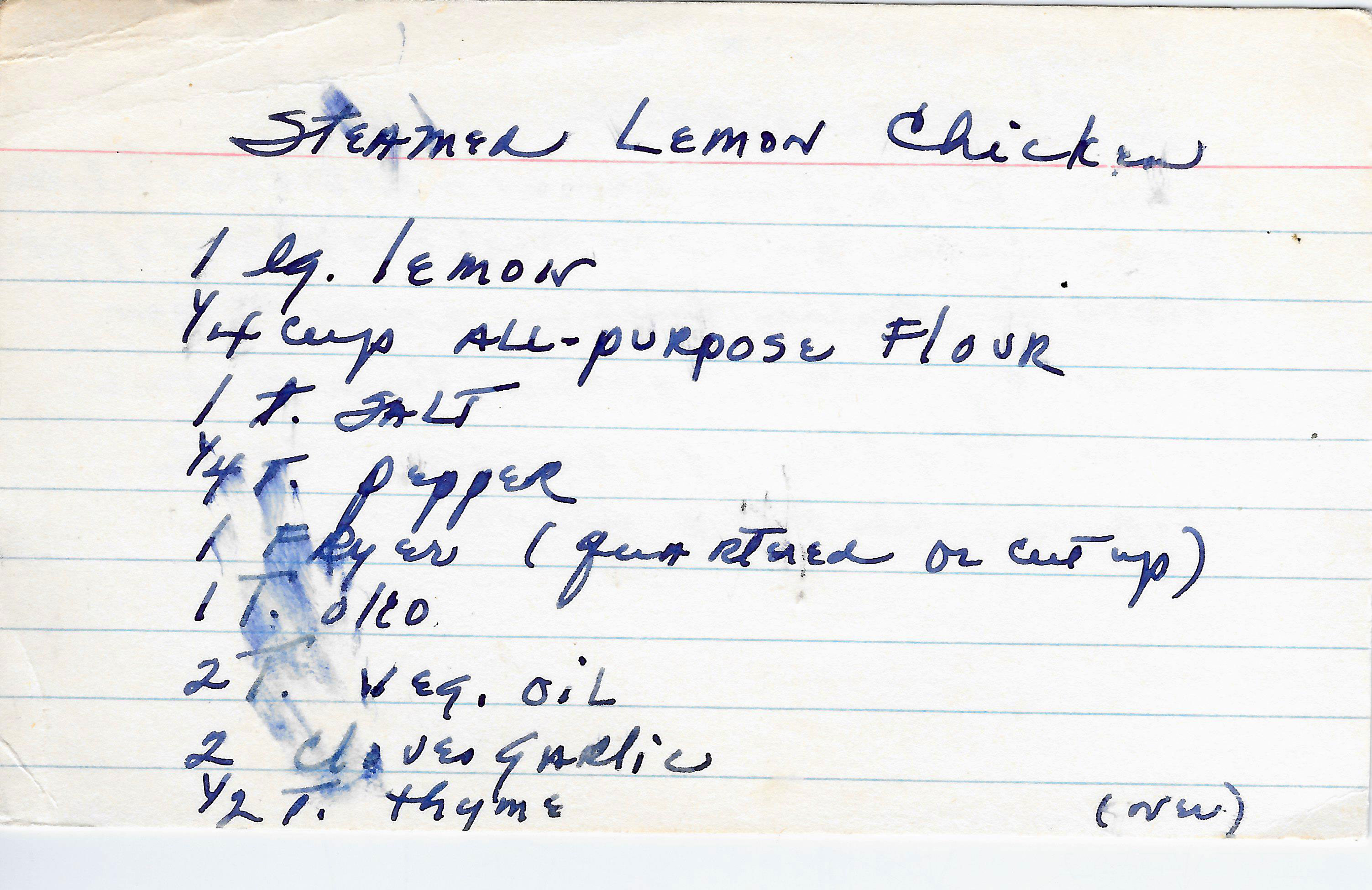 Braised chicken pieces simmered with lemon, garlic, thyme and wine.