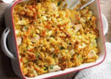 Zucchini, carrots and onions with chicken baked and topped with stuffing.