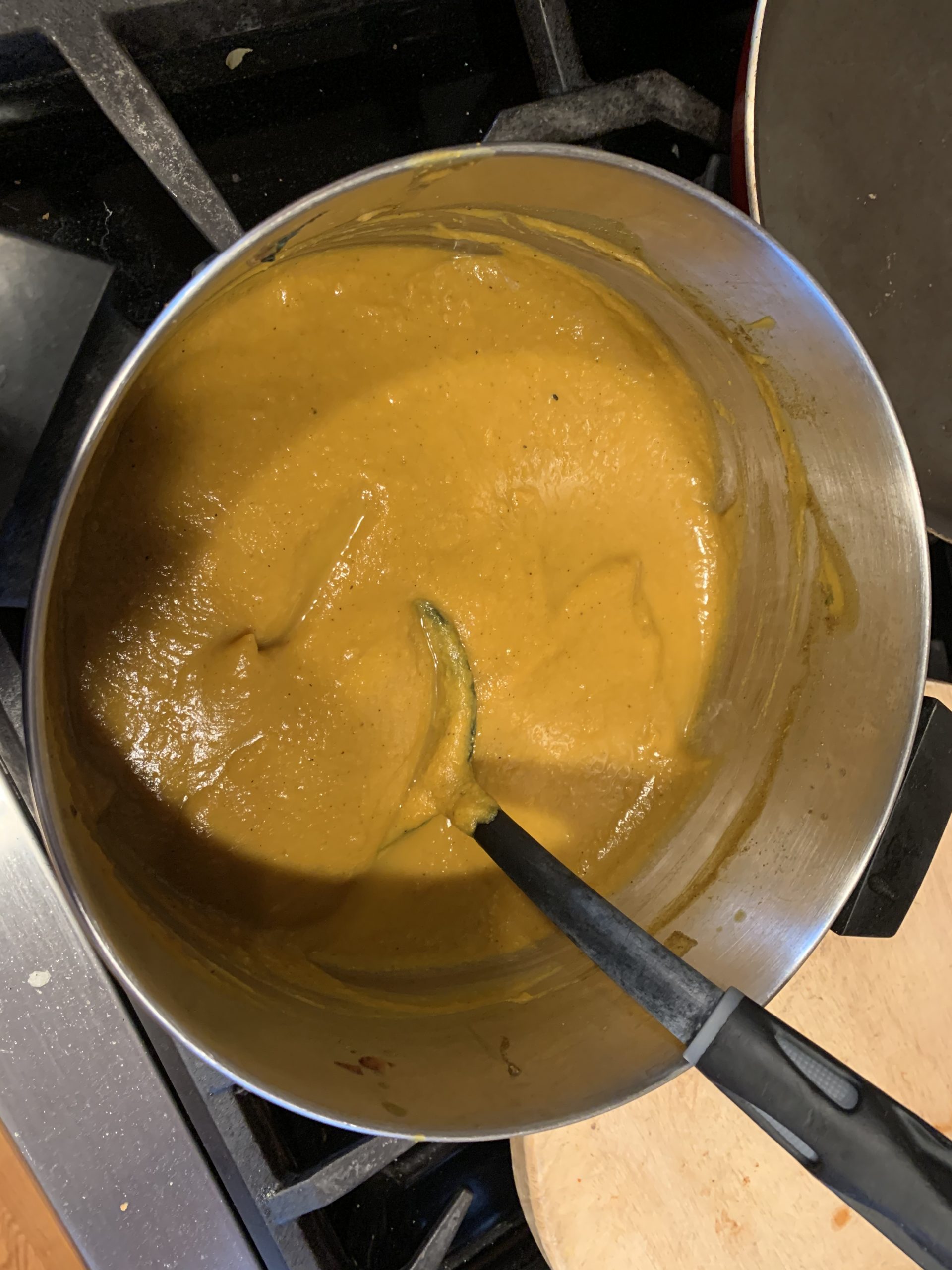 In a small sauce pot with the bottom sprayed with Pam, saute, covered on low -half of one sweet onion, 3 garlic cloves, 1 inch fresh peeled ginger, and 1 quart of raw butternut squash for about 10 minutes until slightly tender.