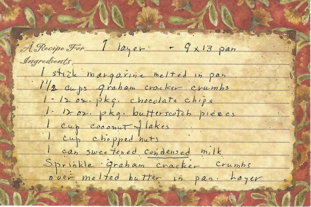 Sprinkle graham cracker crumbs over melted butter in a 9x13 pan. Layer ingredients in order as listed (choc chips, butterscotch, coconut, nuts), sprinkling each in pan. Pour milk over all.