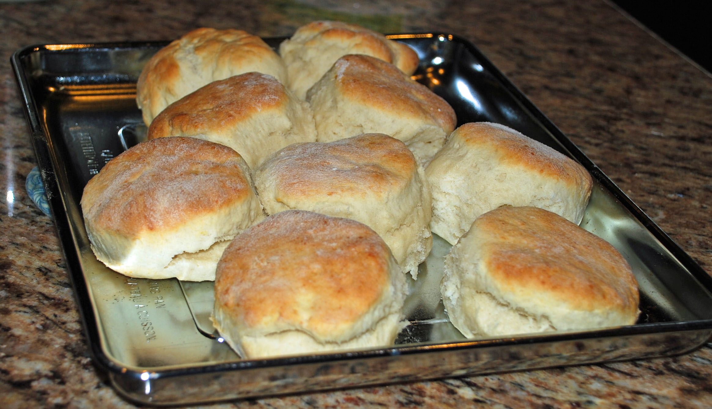 Note: The biscuits can be made ahead through the point of putting the biscuits in the freezer just before baking, and then frozen in a sealed container or bag. When ready to prepare, whisk an egg together and brush over top of biscuits after placing them on baking sheet, then bake completely frozen for about 25-28 minutes.