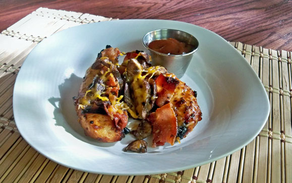 BBQ grilled or pan fried chicken topped with sautéed mushrooms, bacon, and cheese - similar to a dish we like to eat at Outback Steakhouse.