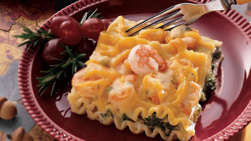 In a 13-x-9-inch baking pan, layer 1/2 cup sauce, 3 noodles, all of the broccoli, and 1/2 cup Cheddar. Next, layer 1 cup sauce and top with remaining noodles, all of the shrimp and 1 cup Cheddar. Then add the remaining sauce and cheese.