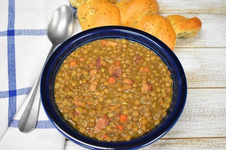 Lentil soup with tomatoes, bacon, onion, carrots and seasonings; a favorite of Aunt Patty.