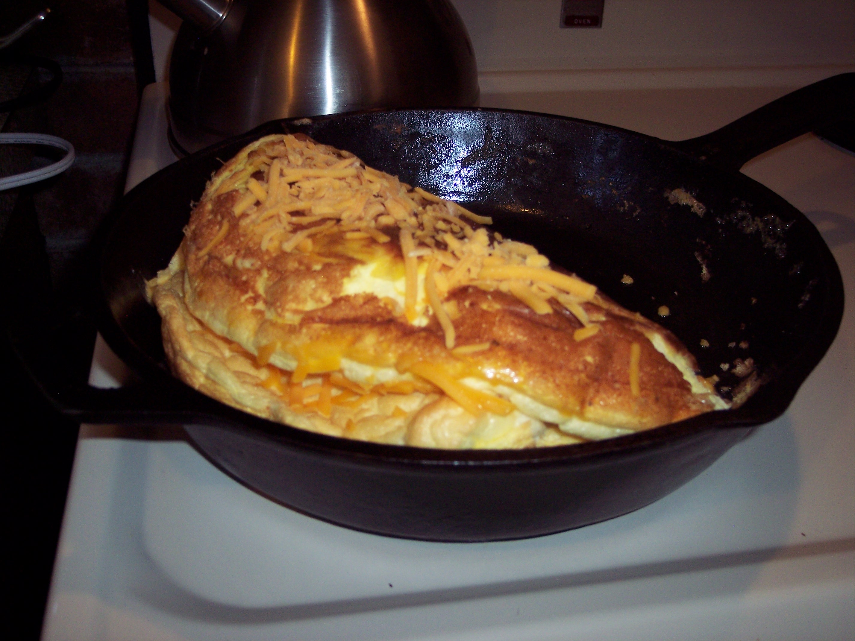 Bake in 350° oven 5 minutes. Sprinkle cheese on top; bake 2 minutes longer or until cheese melts. Remove from oven. Loosen edges, make a shallow cut through the center. Fold omelet in half. Serve on warm plate.