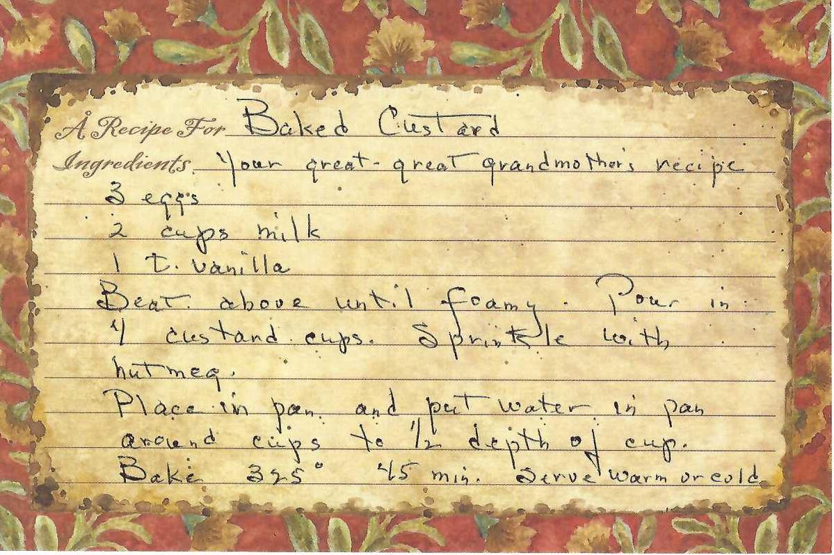 Place in pan an put water in pan around cups to 1/2 depth of cup. Bake at 325° for 45 minutes. Serve warm or cold.