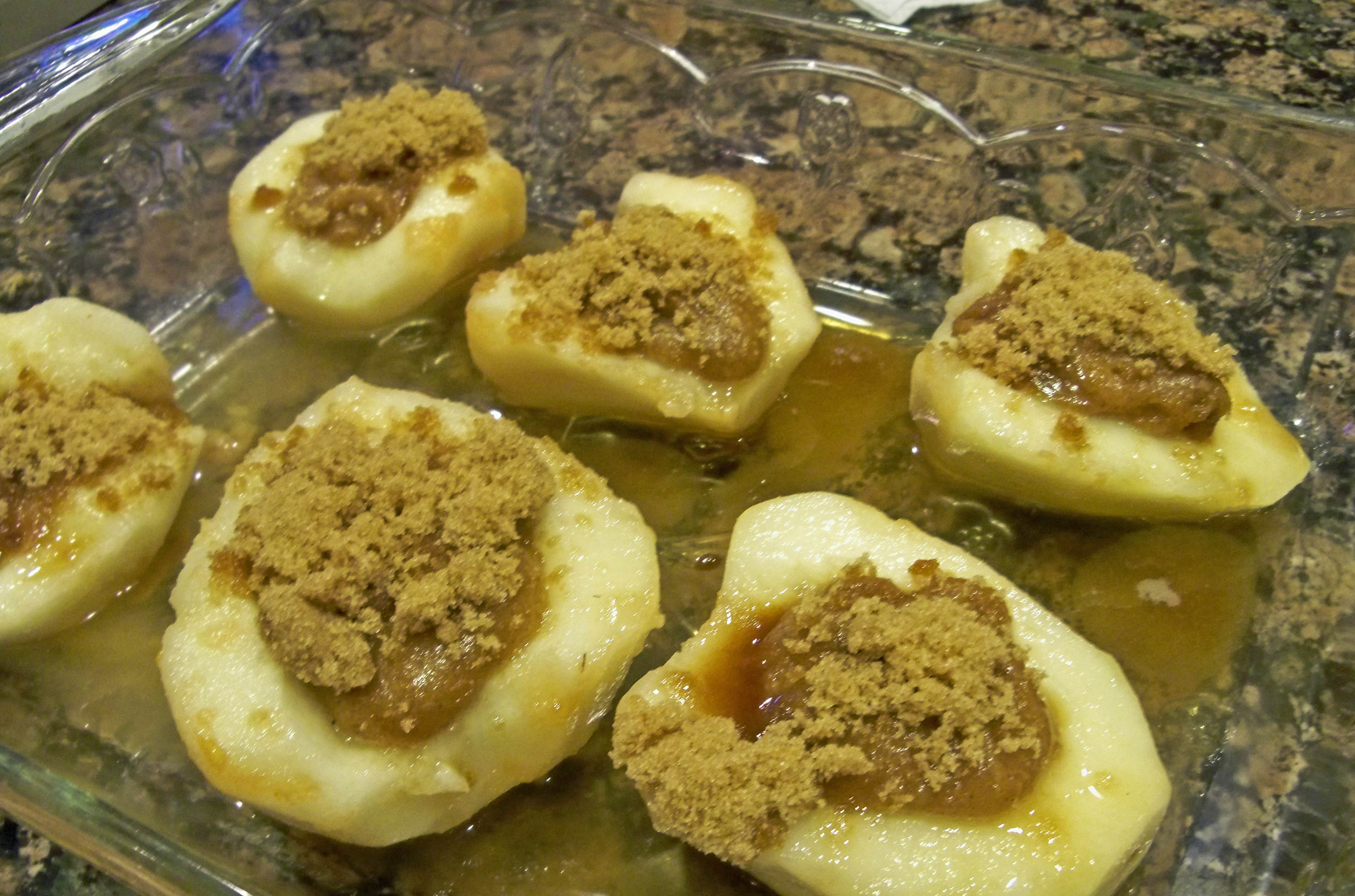 Use a melon baller or spoon to scoop out core of each pear half. Spoon streusel evenly into pear halves. Place pear halves, cut side up, in a baking dish. Pour apple juice and brandy into dish over pears. Cover dish with foil. Bake at 375 degrees F for 30 minutes.