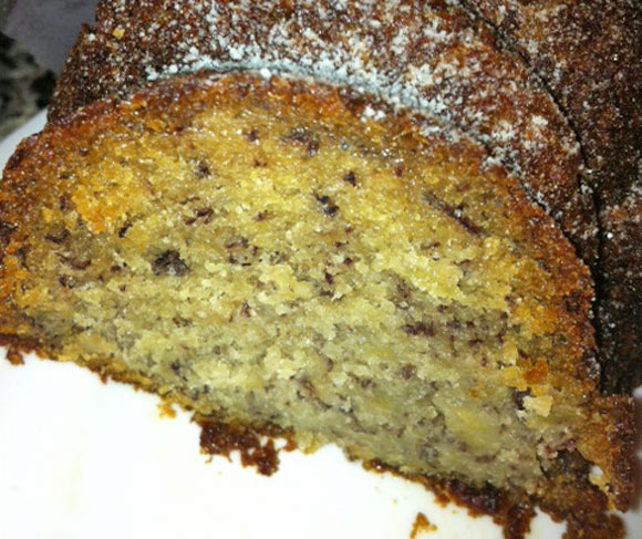 Pour into greased bundt cake pan and bake at 350° F for one hour; turn out onto plate and sprinkle top with powdered sugar.