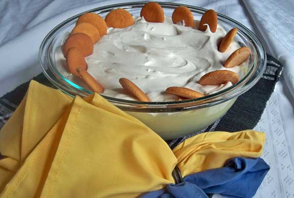 A tasty dessert with banana pudding, whipped cream, and nilla wafers.