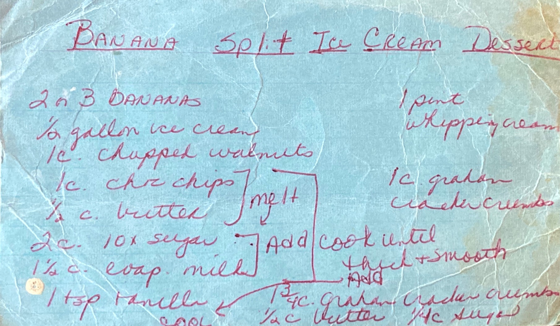 Layered frozen dessert with graham cracker crumbs, bananas, ice cream and chocolate.