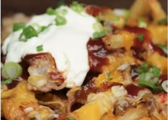 8. Garnish with sour cream, chopped scallions, and barbecue sauce on top. Give everyone a fork and serve right out of the skillet.