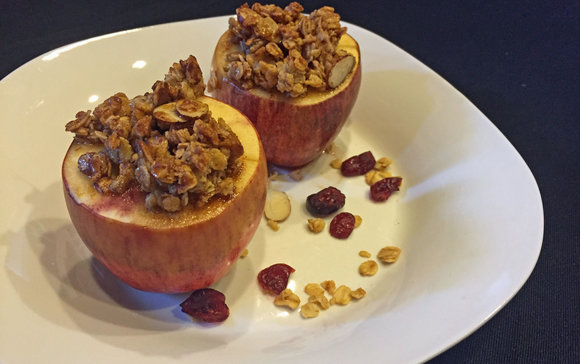 Apples cored and filled with berries, topped off with granola and baked; a delicious healthy dessert.