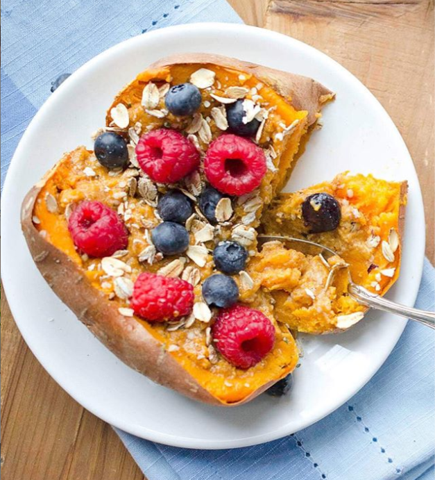 3. Return the mashed sweet potato mixture to the sweet potato shells. Top with oats, berries, and granola. To make the texture more interesting you can dry toast the oats. (Do this by adding them to a non-stick pan. Then toast on medium heat and then watch closely to prevent burning.) Serve with additional maple syrup, if desired.