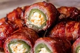 5. Wrap each sausage covered jalapeno with bacon. It may take two pieces of bacon per armadillo egg. Secure with toothpicks.