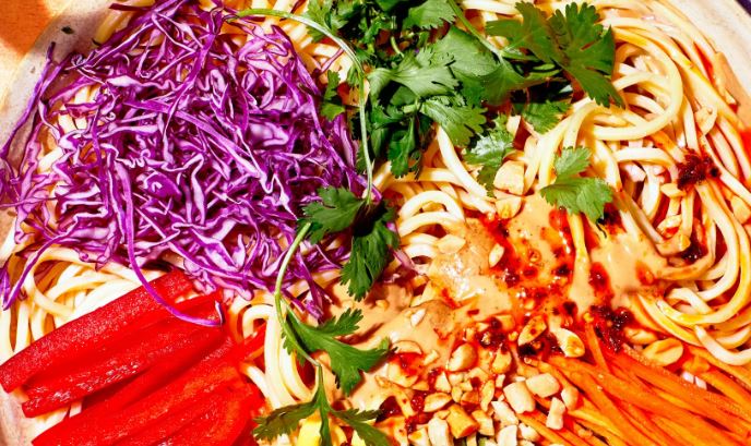 Drain noodles and divide among bowls. Top with some strips of egg and some bell pepper, carrot, cucumber, and cabbage. Pour ½ cup sauce over each bowl; top with peanuts and cilantro. Serve with chili crisp alongside.