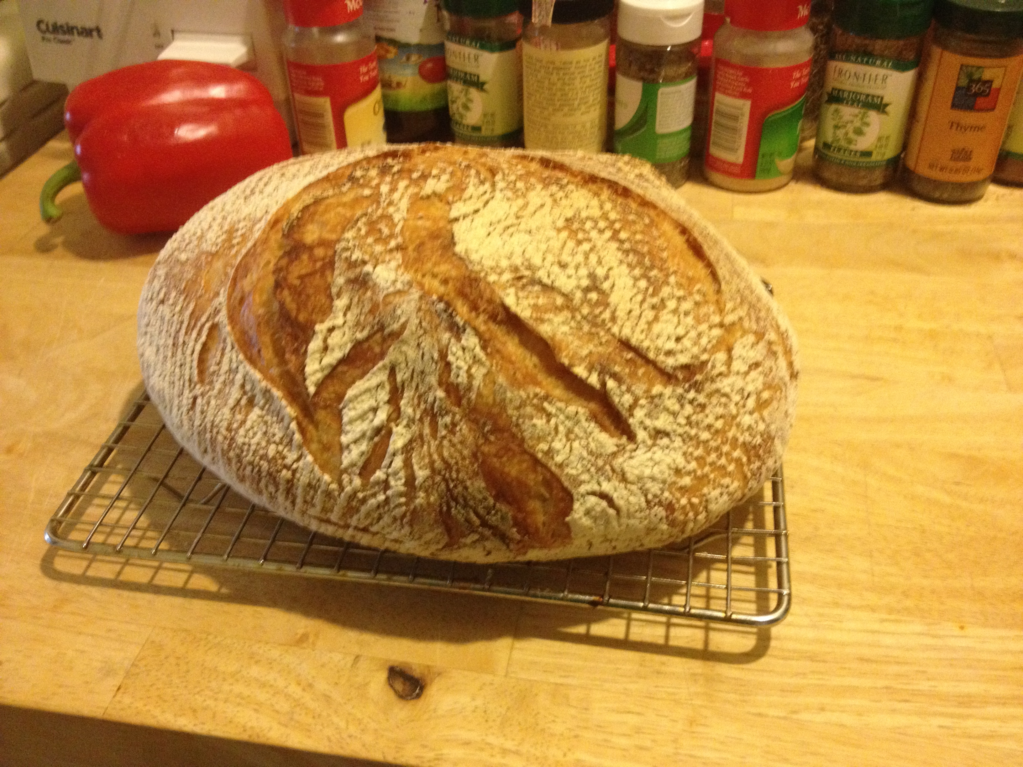 Preheat oven to 450-500°F. Place the pot in the oven at least 30 minutes prior to baking to preheat. Once the dough has more than doubled in volume, remove the pot from the oven and place the dough in the pot seam side up. Cover with the lid and bake 30 minutes Then remove the lid and bake 15-30 minutes uncovered, until the loaf is nicely browned.