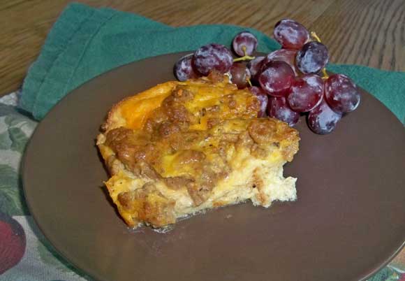 Remove crusts from bread slices; spread bread slices with butter. Place in a 13x9-inch baking dish and set aside. Cook sausage until brown, stirring to crumble; drain well. Spoon over bread slices; sprinkle with cheese. Combine eggs, milk, salt and pepper; mix well and pour over cheese. Cover casserole and chill overnight. Remove from refrigerator 30 minutes before baking. Bake casserole, uncovered, at 350 degrees for 45 minutes or until set.