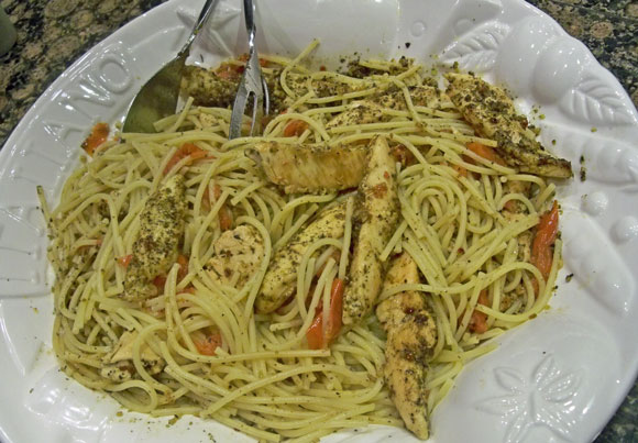 Remove tomatoes from baking pan and coarsely chop. Spoon them into a large serving bowl. Add pasta, chicken, pan juices, reserved oil mixture and vinegar; toss to coat.