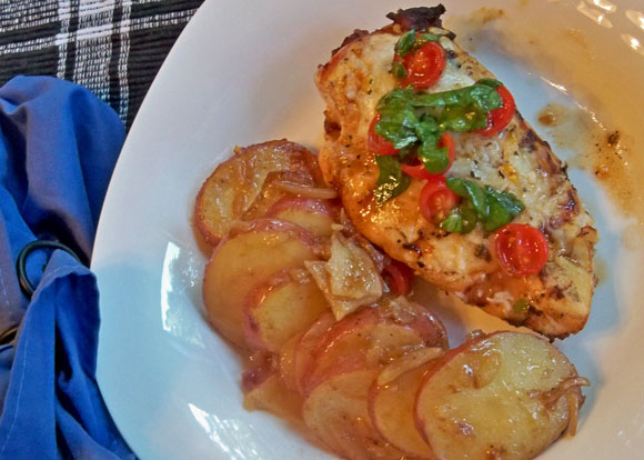 A fresh tomato and basil salad with marinated chicken breasts topped with mozzarella.