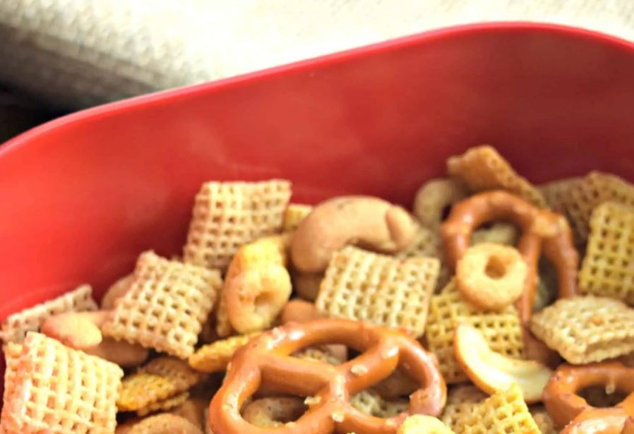 Homemade Chex Mix snack made with gluten-free and dairy-free ingredients.