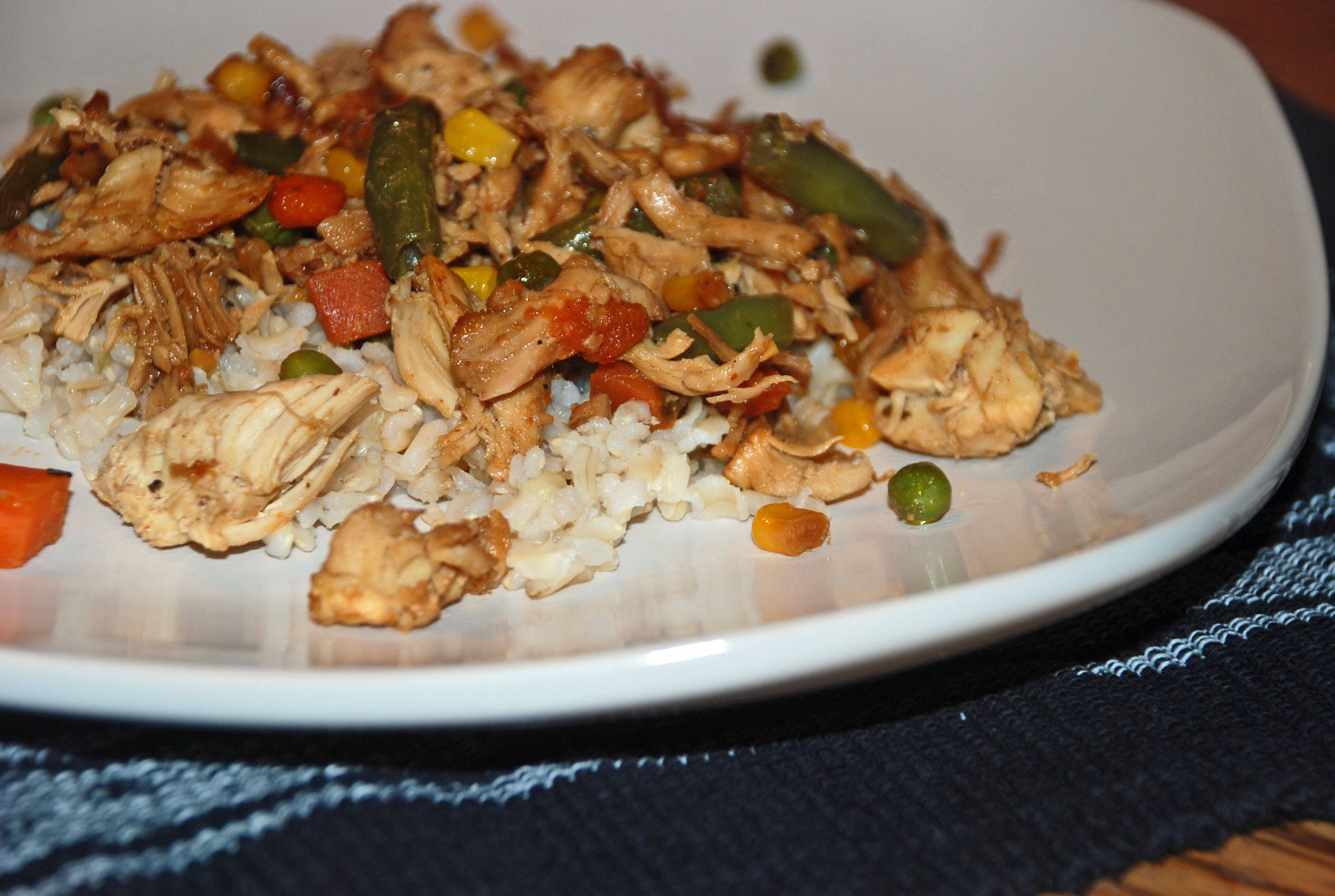 Quick dinner, pulling together some chicken and frozen vegetables in a stir-fry over rice.