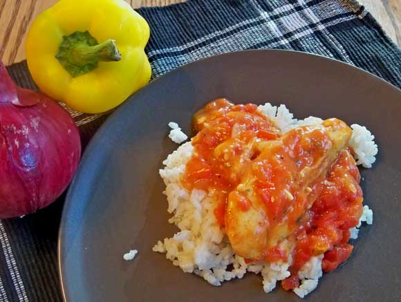 For sauce, skim fat from the tomato mixture. Stir together cornstarch and 1 tablespoon cold water; add to tomato mixture. Cook and stir until thickened and bubbly. Cook and stir for 2 minutes more. Serve chicken and sauce with rice. If desired, sprinkle with toasted sliced almonds.