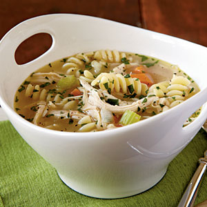 Remove chicken and bay leaf from pot; take meat from bones, dice, and return to broth, and add the noodles.