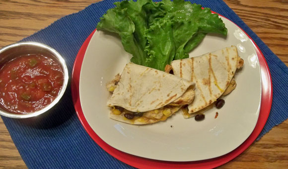 Place 2 tortillas on grill. Top half of each with 2 tablespoons of cheese, some of the chicken strips, about 1/4 cup of the corn mixture, and 2 tablespoons more of cheese. Fold in half and grill 1 minute; turn over and grill another minute. Repeat with all ingredients.