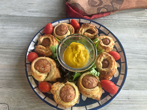 Lightly brush pastry with Dijon or yellow mustard. Roll up one sausage link in the pastry, making sure the edges seal well. Repeat with remaining puff pastry and sausages.