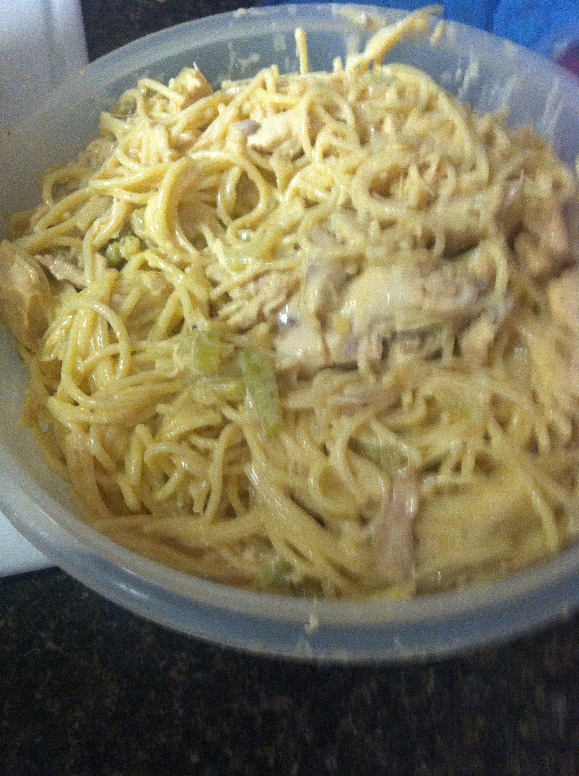 Take your whole chicken cut up and put in a large pot filled with water (for more flavor add some chicken boullion) boil until done. (This can be done earlier in the day so the chicken can cool before de-boning). Chop up your vegetables and begin sauteeing them on a medium heat in the butter. While the vegetables are sauteeing begin to de-bone the chicken. Save your chicken stock (water) for boiling your pasta. While your pasta is boiling add your deboned chicken in with your sauteed vegetables.