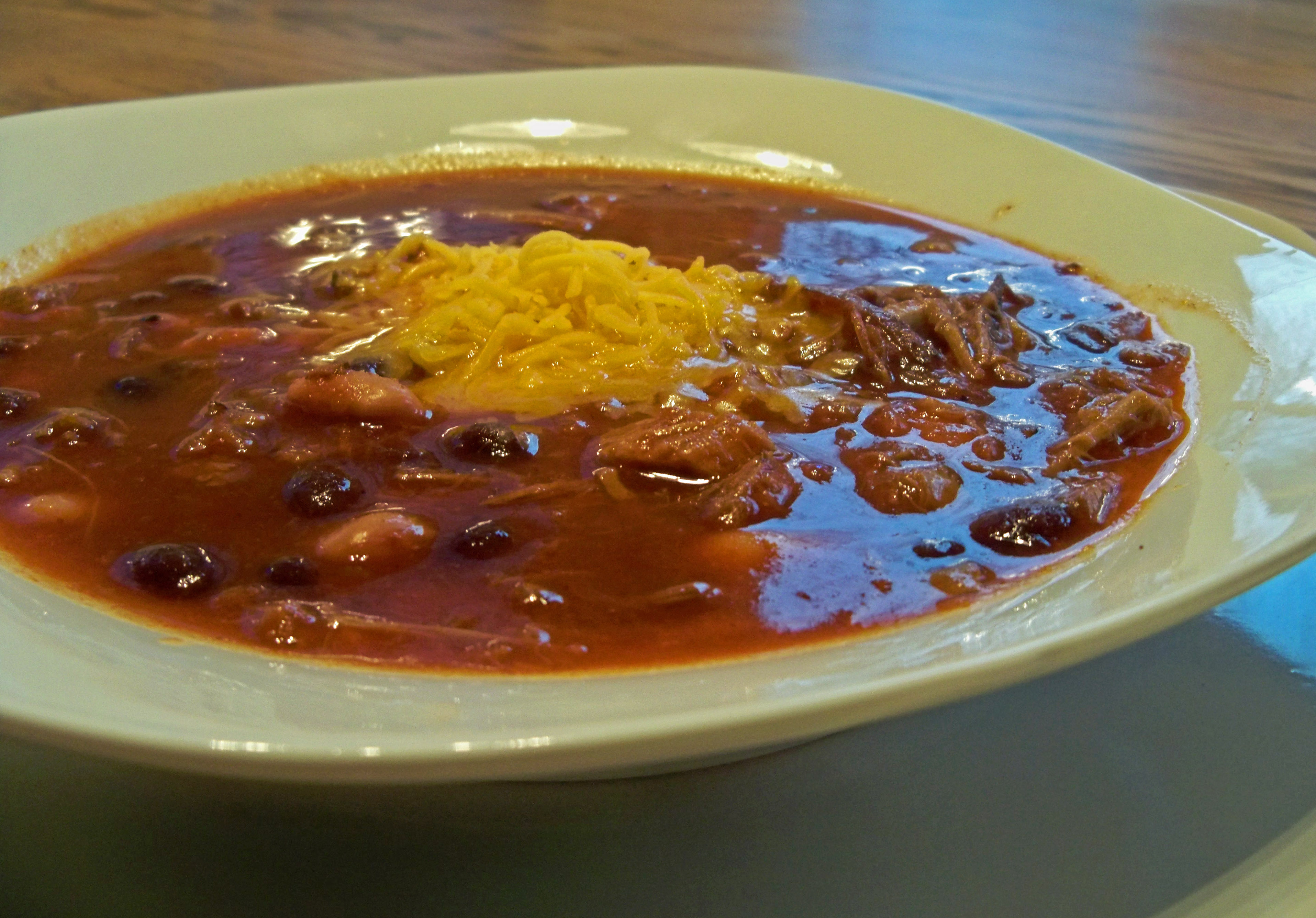 Cook the ground beef (and/or shredded roast beef) and onion until browned; drain grease. Add beans, chili powder, tomato sauce, salt, catsup, and water. Let simmer for 30-45 minutes, or until it reaches the right thickness (add water as needed to achieve desired thickness).