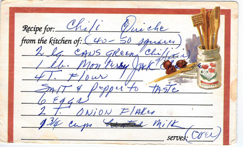 Green chilies baked as bottom of quiche seasoned with cheese and onion; cut into small squares for serving.