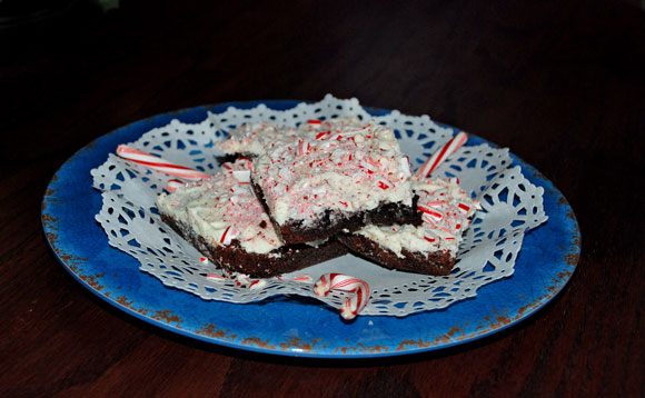 Chocolate brownies with white chocolate frosting topped with crunchy peppermint candy pieces.