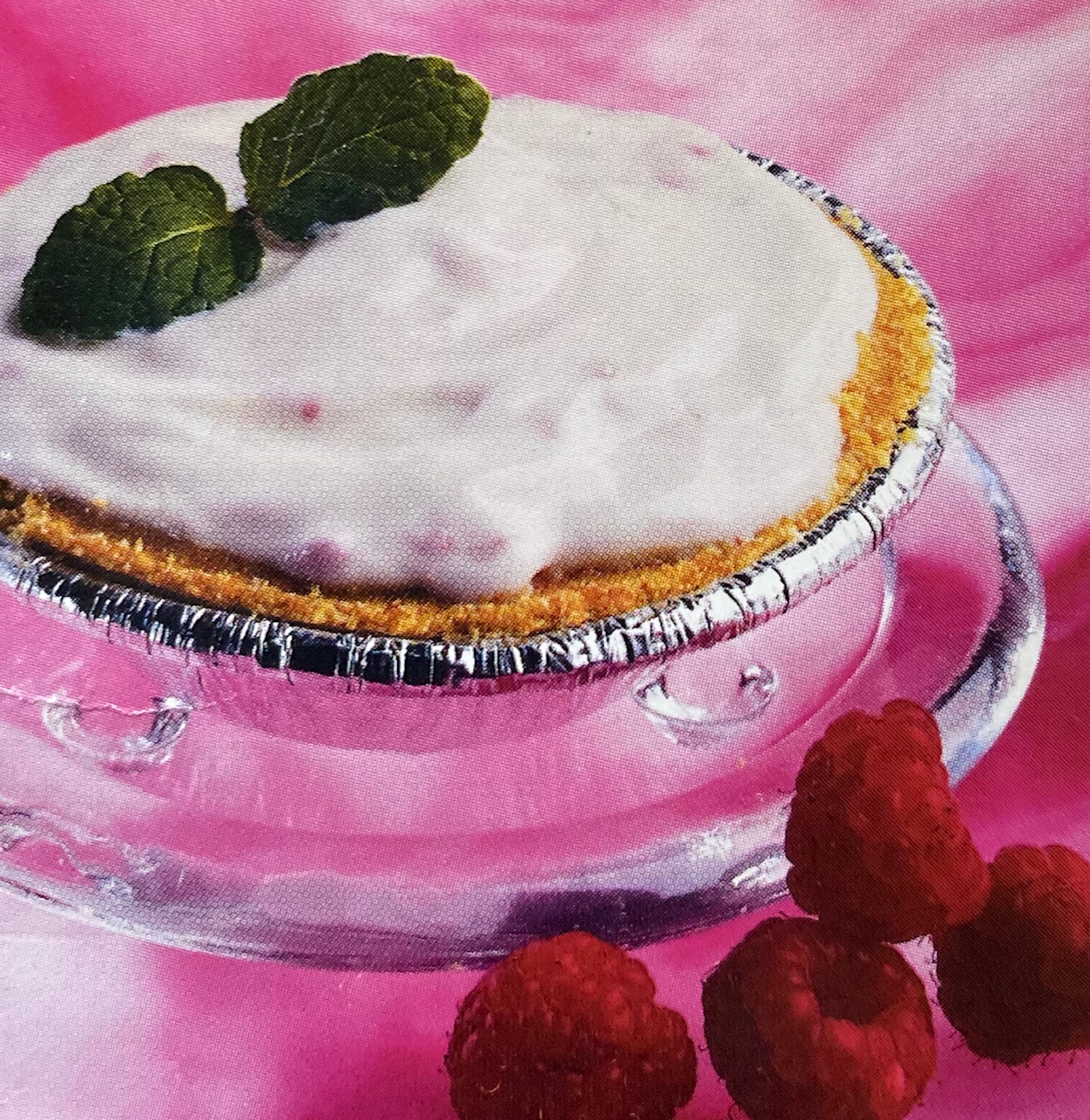 White chocolate or vanilla pudding and raspberries served in graham cracker crusts.