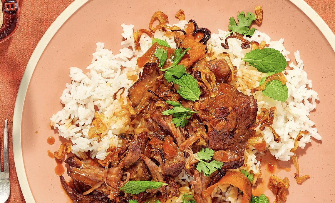 Using a fork, break apart pork in pot just slightly. Spoon some steamed jasmine rice onto plates or into shallow bowls. Divide pork over and top with some sauce from pot. Scatter crispy shallots and some cilantro leaves with tender stems and mint leaves on top.