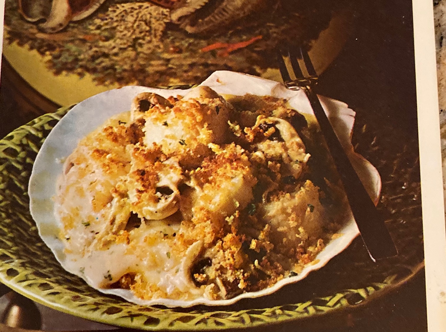 Carefully stir in wine, lemon juice and parsley. Add scallops. Turn into 8 scallop shells or 1-1/2 quart casserole.