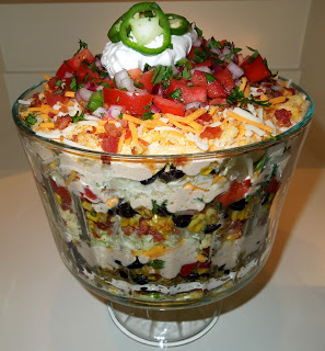 For the top, reserve some of the pico de gallo, bacon crumbles, and cheese to garnish. Use plain sour cream dolloped on top as a garnish. When serving a salad that includes spicy or hot peppers, place a few visible as a garnish, letting people know what's inside of the dish. So, a few rounds of jalapeno are placed on top of the sour cream for the finishing touch.