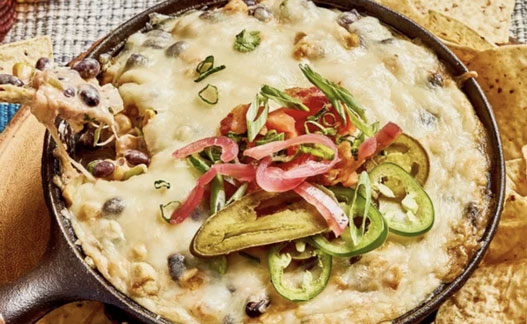 Hot appetizer dip made with cheese, black beans, corn, green chiles, salsa, taco seasoning, jalapenos and toppings; perfect for dipping with tortilla chips.