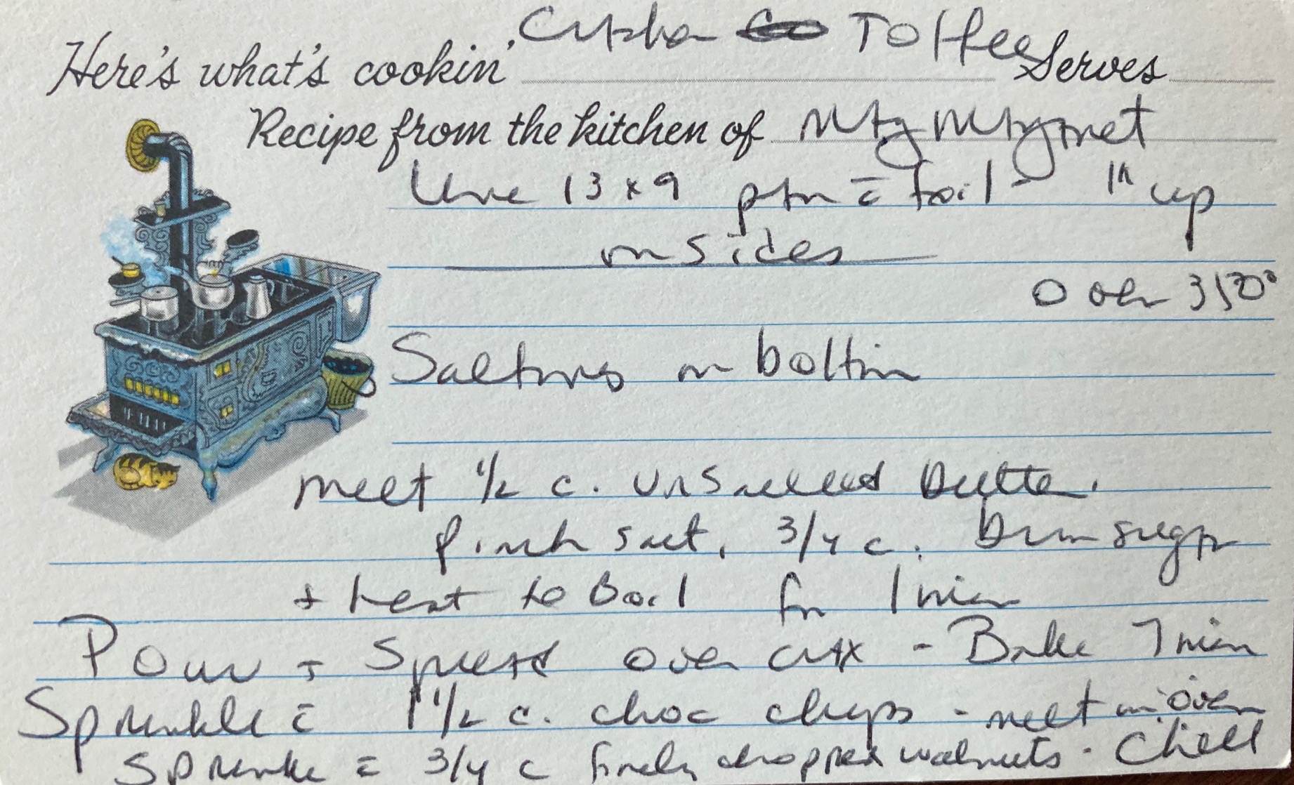 Saltine crackers topped with sweet toffee mixture and a layer of chocolate chips and walnuts.