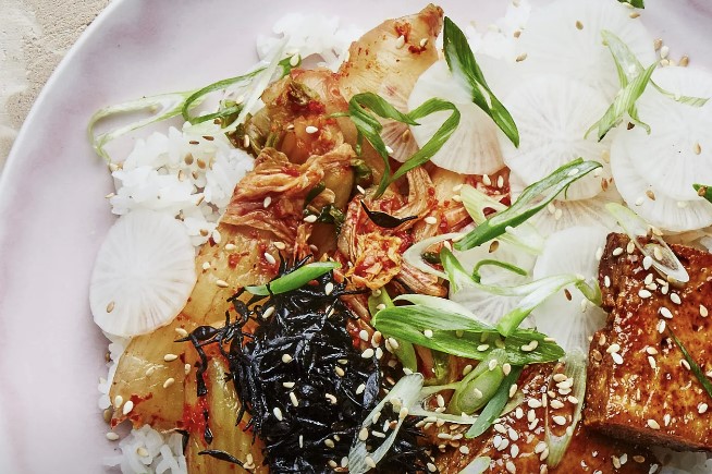 - - kimchi, toasted sesame seeds, hijiki, daikon, sliced scallions and steamed rice (for serving, optional)