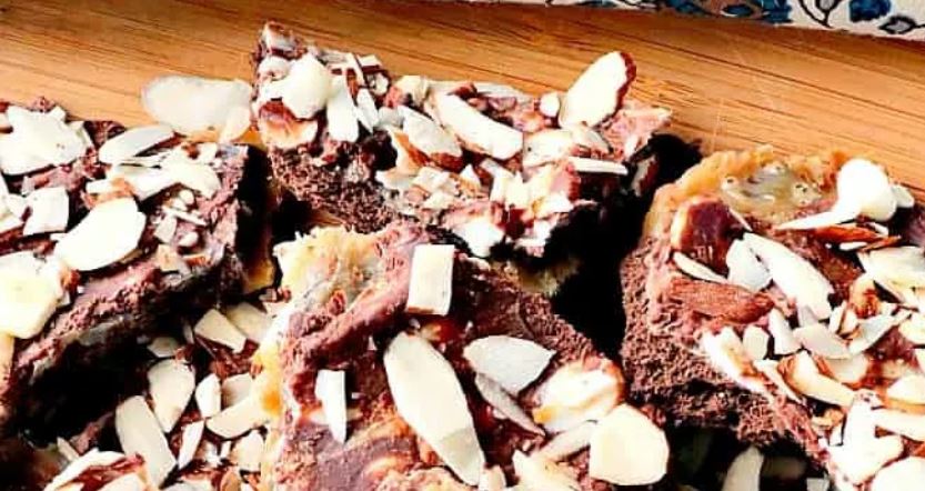 Graham crackers topped with brown sugar glaze, melted chocolate and slivered almonds.