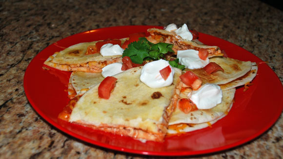 Place pan in oven with broiler turned on high, and allow to broil for 3-5 minutes or until top tortilla has begun to brown a bit and cheese is thoroughly melted.