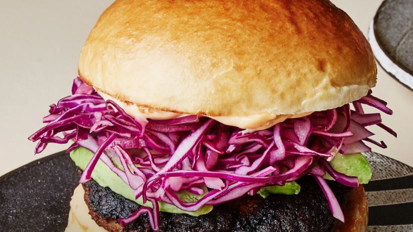 Divide Sriracha mayo among cut sides of buns, spreading to edges. Place patties on bottom buns, then shingle the avocado slices over top. Heap slaw over avocado, then top burgers with top buns.