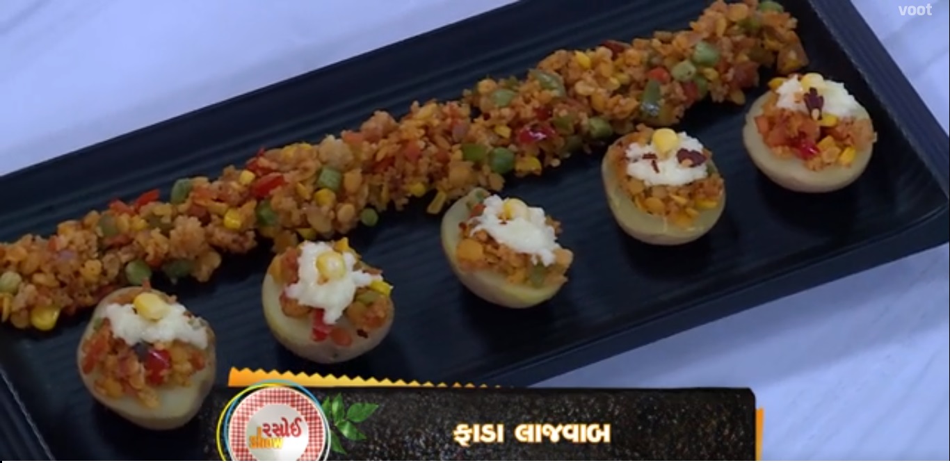 Now in a baking tray, take the potatoes, stuff with the mixture, add cheese and cook in a preheated oven on 180 degrees for 5 to 7 minutes.