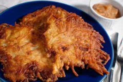 Heat oil in a large skillet (or two if you've doubled the recipe) over medium to high heat. Using a large spoon drop latke batter into hot oil (about 1/4 cup of batter per latke). Flatten and shape with back of the spoon so they are about 1/2 inch thick and pancake shaped. Fry until edges appear browned then flip to fry the other side. When cooked they should be golden brown on both sides. Remove to paper towel lined tray and keep warm in low oven till serving.