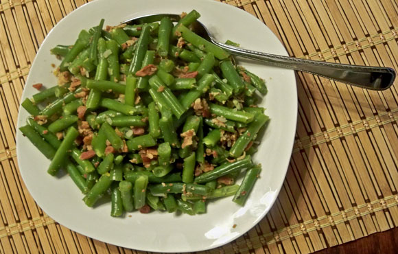 Fresh green beans simmered and seasoned with bacon and onion for a quick side dish any week night.