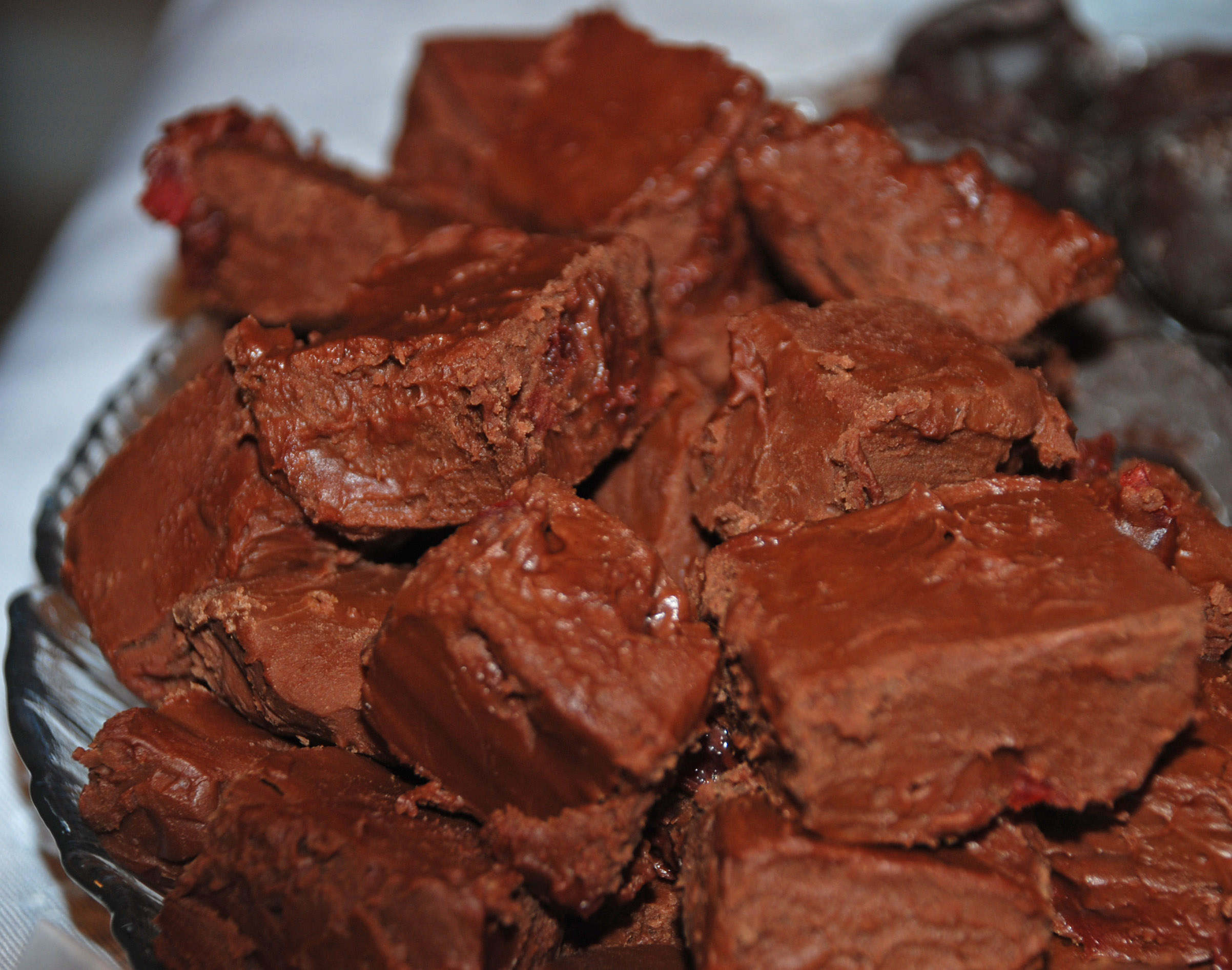 Be sure to chop the maraschino cherries and let them dry on the counter overnight so their juice will not make the fudge runny. The fudge can be frozen for up to a month before thawing in fridge for serving.