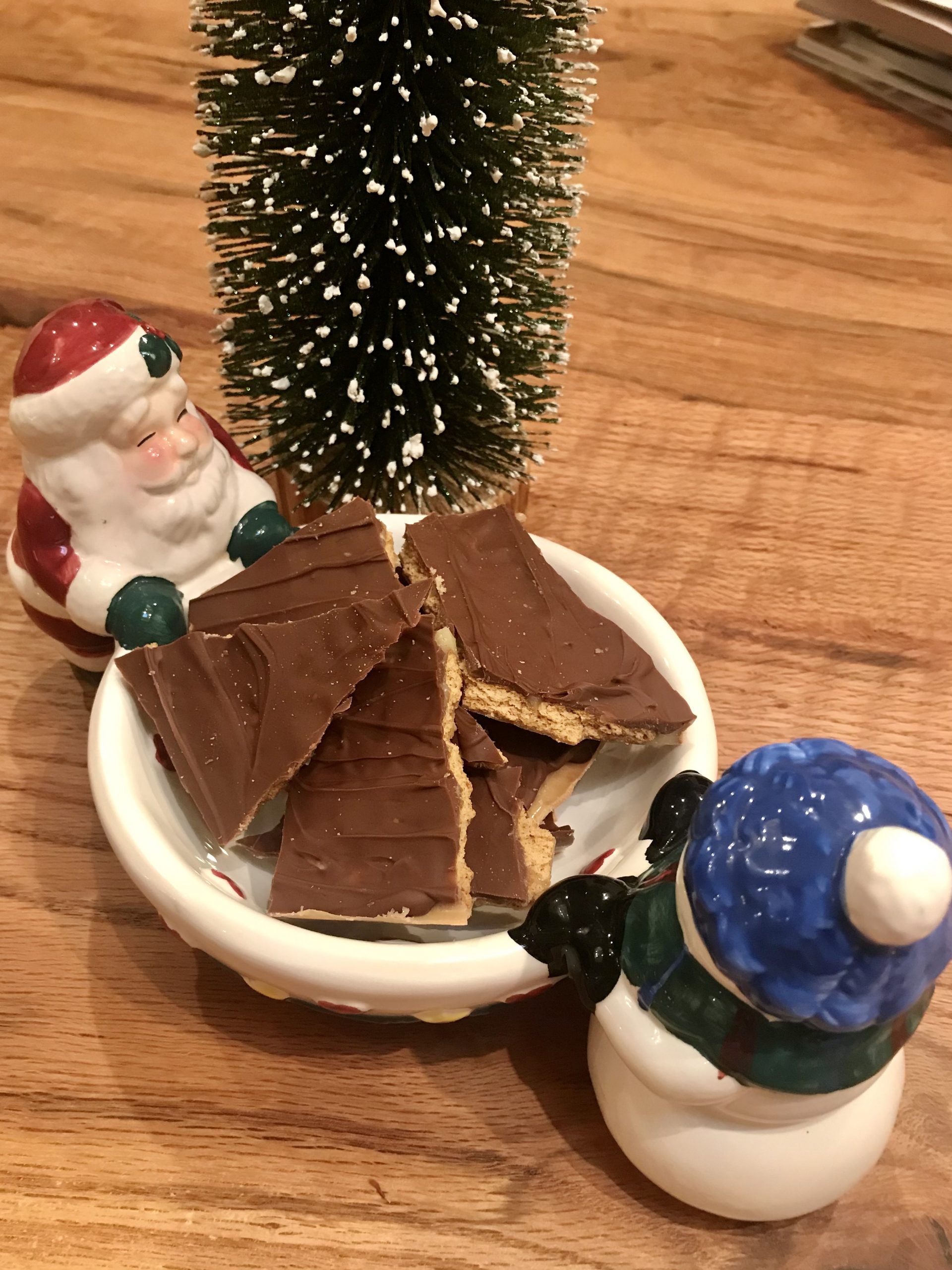 Pour mixture over heavy foil covered cookie sheet filled with graham crackers.
