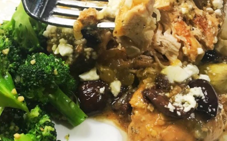 Instant Pot Greek chicken cooked with kalamata olives, artichoke hearts, and seasonings.