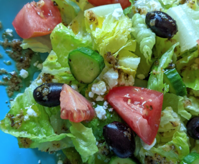 lettuce, red cherry or grape tomatoes, celery, kalamata olives, cucumbers, red pepper, avacado, feta cheese, capers-if desired, red onion rings-if desired